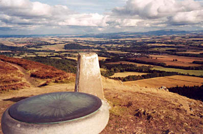 ![]() "This compass plate was erected in 1926 "In memory of Sir Walter Scott from this spot he was wont to view and point the glories of the BORDERLAND" This is the view directly eastwards from the top of the middleEildon hill at 1385 ft. You can make out St. Boswell's at one o'clock, and - (with binoculars in my case, and magnifying glass in yours) just to the left of it you can see the college, or Tweed Horizons as it's now called. The Big Eildon hill lies at 10 o'clock, while the little one is directly south. Edinburgh lies 32 miles away at 8 o'clock.Smailholm Tower lies 5 1/4 miles away at 11 o'clock. Melrose lies immediately to the north, where I found cinnamon scones, muffins and shortcake, and a large pot of tea, having climbed all 3 Eildons." (photo source and commentary : Robbie Dempsey) |
